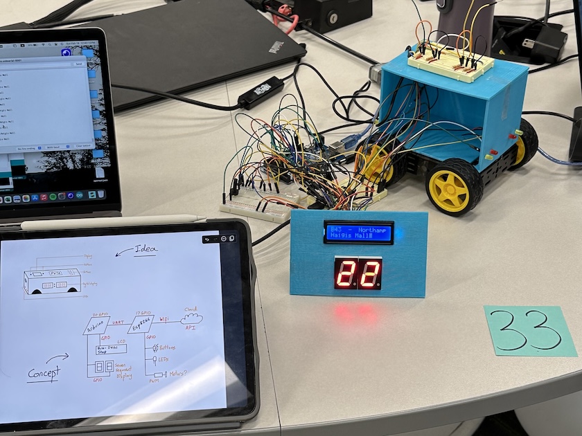 As a part of this project, I developed a system that provides real-time transit information by utilizing a public transit API. The project involved integrating an Arduino Mega and ESP8266 using serial communication for accurate bus updates. I implemented 7-segment displays for timing and an LCD screen to clearly present bus information, ensuring easy and quick access to real-time updates.